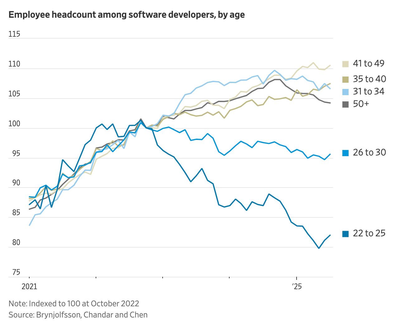 Lo vinculo con un paper reciente de Stanford1 que muestra que desde fines de 2022, la IA está reduciendo el empleo joven en roles automatizables (−13%). Los seniors, en cambio, crecieron hasta un 9%.